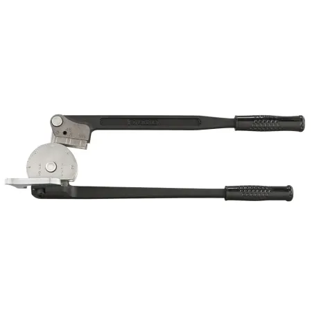 Конструкция трубогиба включает стартовый угол 90°, эргономичные рукоятки с компенсационным смещением для снижения усилия и специальный гибочный башмак, обеспечивающий высокую точность гибки. На корпус нанесена шкала в метрической и дюймовой системах, что упрощает контроль угла изгиба и повышает повторяемость результата.