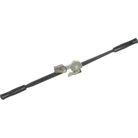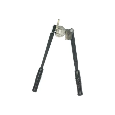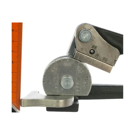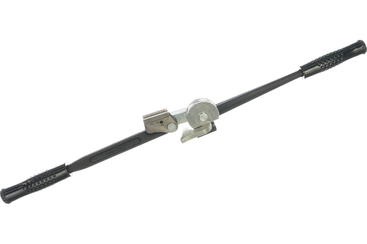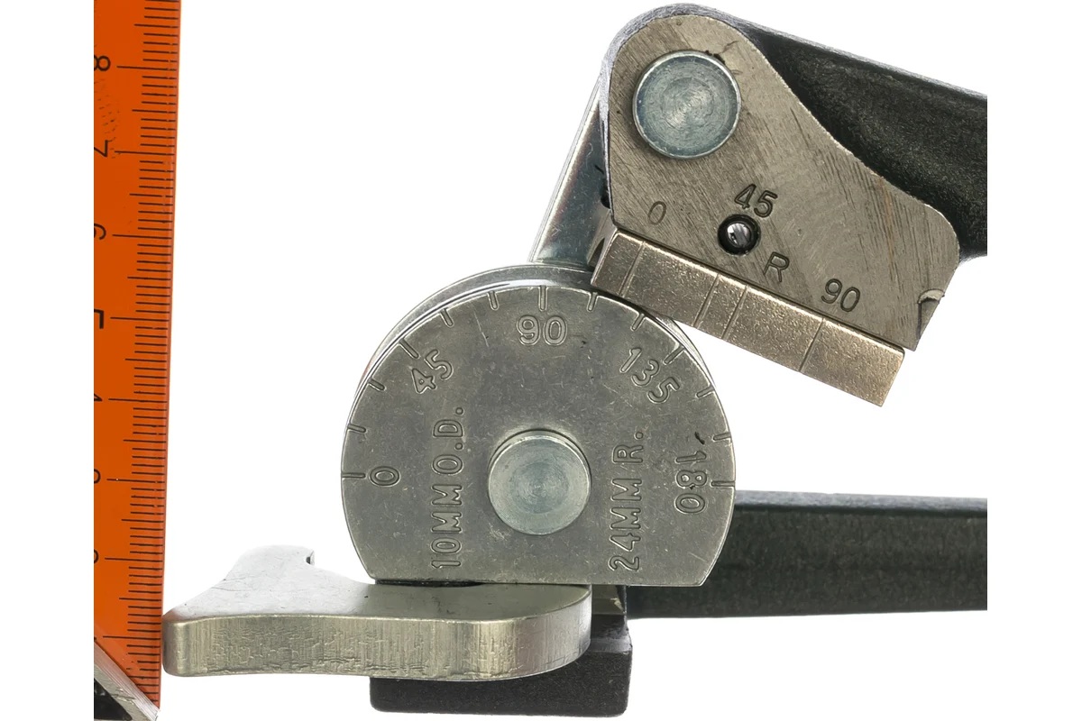 Конструкция трубогиба включает стартовый угол 90°, усиленный гибочный башмак для снижения усилия и эргономичные рукоятки со смещением, обеспечивающие удобный хват и контроль процесса. Нанесённая шкала в метрической и дюймовой системах облегчает точную настройку угла изгиба.