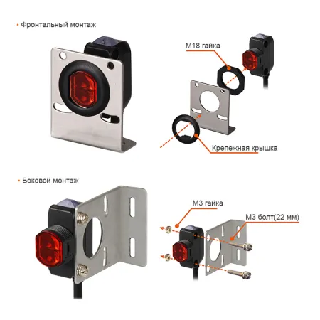 - Регулировочная отвертка, крепежный кронштейн, крепежная гайка М18, крепежная крышка, болт М3, гайка М3