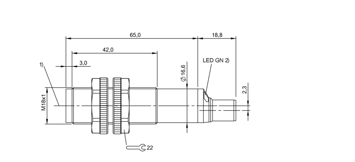 Диапазон измерения: 60000 мм • Электрическое подключение: разъём M12x1 • Крепежная резьба: M18x1 • Рабочее напряжение: 12 ÷ 24 V DC • Материал корпуса: пластик