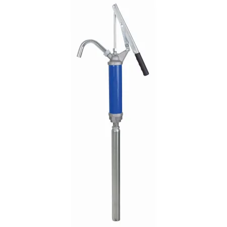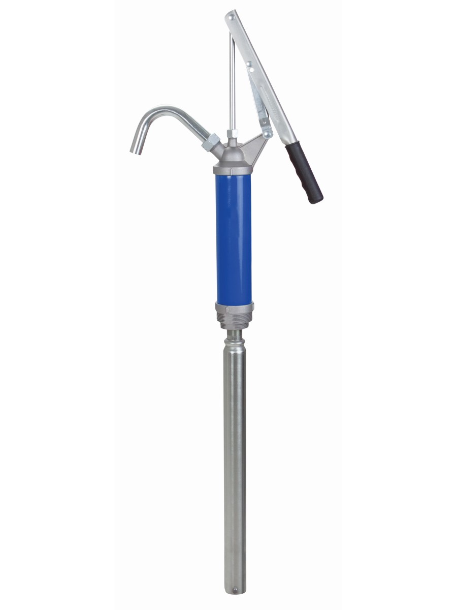 Ручной рычажный насос для перекачки масла, ДТ и керосина. Подходит для использования с бочками объемом 50-250 л. Оснащен изогнутым носиком, бочковыми адаптерами 1 1/2" и 2" и телескопической всасывающей трубкой. Используемые материалы: сталь, алюминий, цинк, латунь, бутадиен-нитрильный каучук