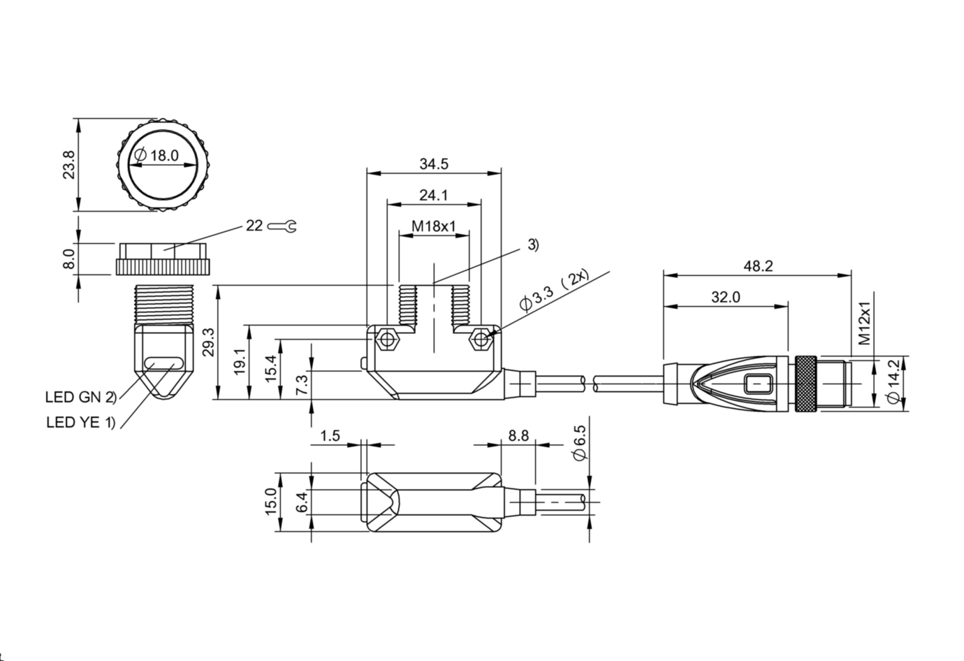 Дискретный выход: PNP • Диапазон измерения: 100 мм • Электрическое подключение: разъём M12x1 • Длина кабеля: 0.15м • Рабочее напряжение: 12 ÷ 24 V DC • Материал корпуса: пластик