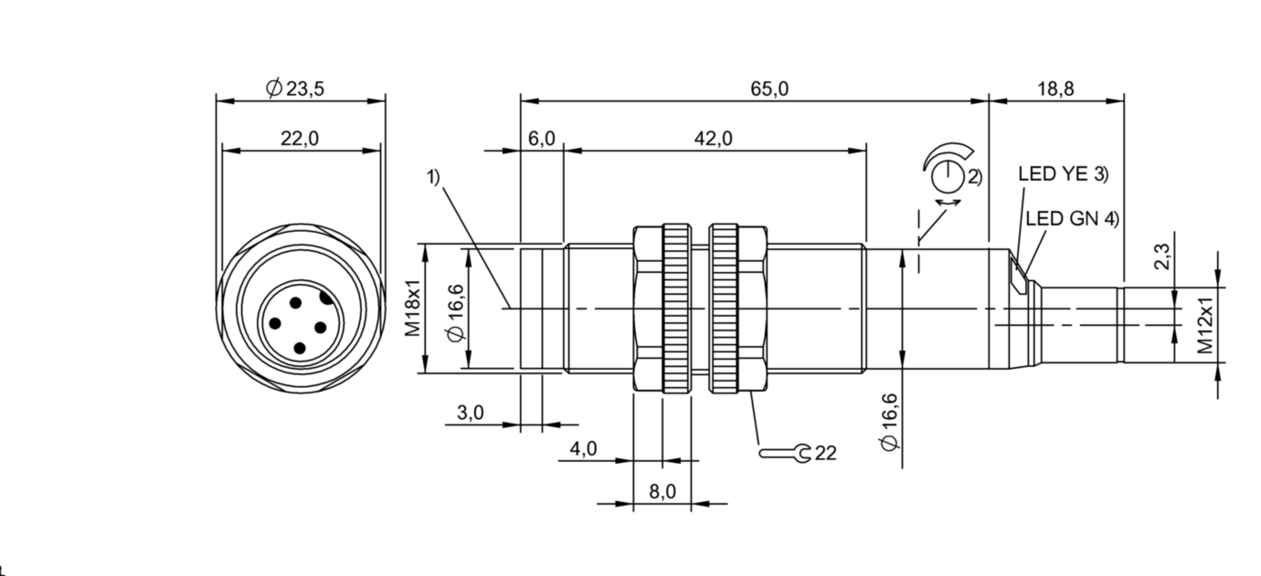 Дискретный выход: PNP • Диапазон измерения: 350 мм • Электрическое подключение: разъём M12x1 • Крепежная резьба: M18x1 • Рабочее напряжение: 12 ÷ 24 V DC • Материал корпуса: пластик