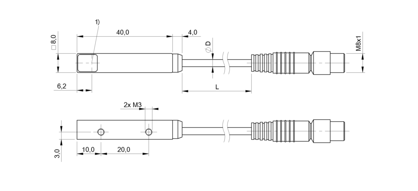 Диапазон измерения: 2200 мм • Электрическое подключение: разъём M8x1 • Длина кабеля: 0.2м • Рабочее напряжение: 12 ÷ 24 V DC • Материал корпуса: цинк