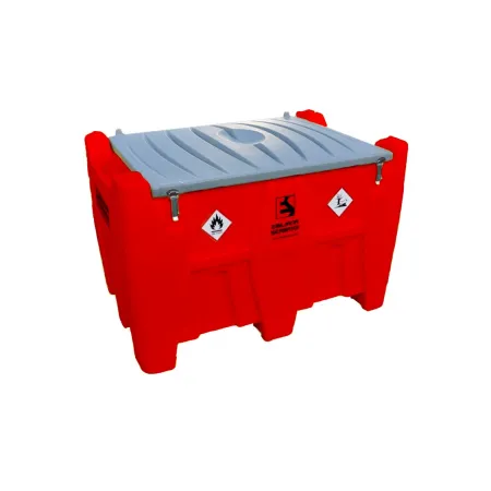 Резервуар для перевозки и хранения масла. Изготовлен из линейного полиэтилена изготовлен по технологии литейного производства. Комплектация резервуара включает интегрированные вилочные карманы для поднятия полного объёма погрузчиком и ручки для поднятия пустого объёма, выемки для крепления транспортными ремнями при перевозке. Все фитинги изготовлены из материала совместимого с жидкостью.