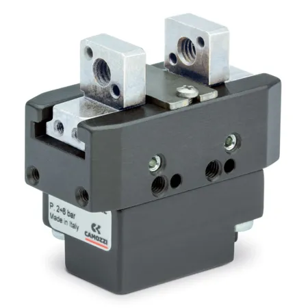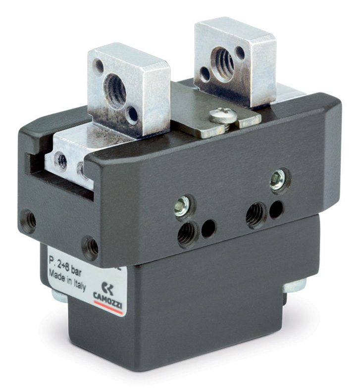 Захваты двустороннего действия с параллельным движением губок Серии CGSP доступны в 4 размерах (20, 25, 32 и 40). Захваты самоцентрирующиеся. Реакции изгибающих моментов на губках и пальцах губок передаются на Т-образные направляющие.