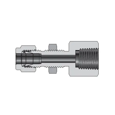 Корпус и комплектующие выполнены из нержавеющей стали AISI 316, обеспечивающей коррозионную стойкость в агрессивных средах. Конструкция — двухобжимная (two-ferrule) обеспечивает многократную высоконадежную герметизацию металлом по металлу. Резьбовое уплотнение — ФУМ-лента. Применимо для инертных и агрессивных газов, воды, гидравлических сред и технологических жидкостей при типичных рабочих температурах от примерно −60 °C до +200 °C и ориентировочном рабочем давлении до ~413 bar (6000 psi) в зависимости от толщины стенки трубки и режима эксплуатации.