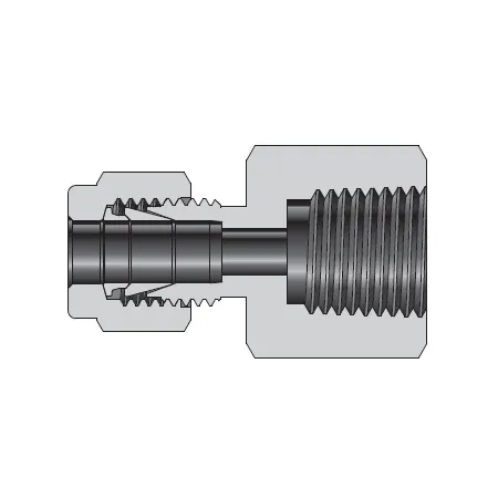 Прямой штуцер обжимного типа с внутренней NPT-резьбой предназначен для герметичного присоединения трубопроводной линии Ø 1 1/2″ (38,1 мм) к резьбовым портам NPT 1 1/2. Конструкция с двумя обжимными кольцами и контргайкой обеспечивает металлометаллическое уплотнение трубки без сварки или резьбовой нарезки на трубе. Резьбу уплотняют ФУМ-лентой (PTFE), после затяжки гайки обжимные кольца создают концентрический зажим и предотвращают протечки при рабочем давлении и вибрациях.