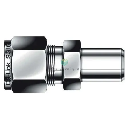 Корпус и сварной конец изготовлены из нержавеющей стали AISI 316 (материал обобщённо: сталь нержавеющая), обжимная система — двойная феррула + гайка по типу DK‑Lok. Тип уплотнения резьбы отсутствует (уплотнение обеспечивают феррулы). Применимы рабочие среды: вода, пар, нефть, природный газ, агрессивные жидкие и газообразные среды, совместимые с AISI 316. Ориентировочные эксплуатационные параметры зависят от толщины трубки и режима сварки; типичные диапазоны для подобных изделий — давление до 200–300 бар и температурный интервал примерно от −50 °C до +200 °C (точные значения подтверждайте по паспорту изделия и условиям сварки).