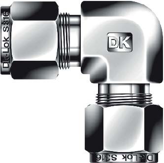 Корпус и все обжимные элементы — нержавеющая сталь AISI 316; общая материализация — сталь нержавеющая, обеспечивающая коррозионную стойкость в агрессивных средах (углеводороды, вода, пар, инертные газы). Исполнение — угловой (90°) с двумя обжимными кольцами и гайкой DK-Lok, без внутреннего уплотнителя резьбы. Применяемые трубки: соответствующие 1 1/4″ наружному диаметру и рекомендованной толщине стенки; рабочие диапазоны давления и температуры зависят от конкретной трубки и режима, типичные ориентиры — до 250 бар и до +450 °C при нормальной эксплуатации.