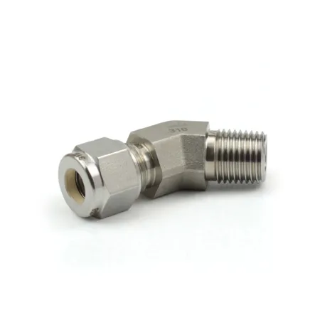 Угловой обжимной штуцер 45° предназначен для перехода с конической резьбы NPT1/2 на трубку Ø12 мм в линиях приборного и технологического оборудования — газ, жидкость, гидравлика и аналитические контуры. Работает по принципу двухобоймного обжима: гайка при затяжке сжимает переднюю и заднюю обоймы, формируя герметичное металло‑металлическое уплотнение на трубке; резьбовое соединение уплотняется ФУМ‑лентой на стороне NPT. Конструкция уменьшает осевые напряжения при резких перегибах и обеспечивает компактный 45° вывод трубки в ограниченном пространстве.