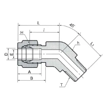 Обжимной штуцер угловой 45° с наружной резьбой NPT1-1" предназначен для компоновки и перенаправления трубопроводов в системах измерения, подачи и отбора проб, а также в технологических линиях с инструментальной арматурой. Конструкция решает задачу герметичного соединения 1" трубки с резьбовым портом NPT1 методом двухкольцевого обжима; наружная резьба уплотняется ФУМ‑лентой (PTFE) для обеспечения газо- и жидко-непроницаемости. Работает по механическому принципу: гайка с двумя обжимными кольцами фиксирует трубку и формирует металл-металл уплотнение, а резьбовой переход обеспечивает присоединение к резьбовому ответному элементу.