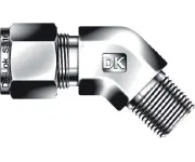 Корпус и обжимные элементы — сталь нержавеющая AISI 316, стойкая к коррозии и большинству агрессивных сред. Конструкция — двухкольцевая (two‑ferrule) с гайкой, стандартный угол 45° для компактной трассировки. Подключение: канал 1 — NPT1/8 (наружная коническая резьба), канал 2 — трубка 3/8″ (внешний диаметр). Рабочие давления зависят от диаметра трубки и стенки, типично до 6 000 psi (≈413 бар) при корректном выборе трубки; температурный диапазон — при использовании ФУМ‑ленты до ≈+260 °C, металл‑к‑металлу — применимы более высокие температуры, низкая температура до −196 °C (крио). Применяется в КИПиА, нефтегазе, химии и энергетике.