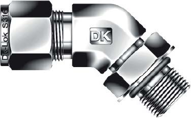 Корпус и элементы — нержавеющая сталь AISI 316, двухколечная компрессионная конструкция (подавляющая и прижимающая втулки) и гайка; резьба UNF 7/16″‑20 с выступающим O‑ring обеспечивает дополнительную уплотняющую поверхность. Применимы рабочие среды: нефть, газ, вода, теплоносители и некоррозионные химические растворы. По спецификациям DK‑Lok для типичных размеров 1/4″ рабочее давление до ≈6000 psi (≈414 bar), температурный диапазон зависит от материала O‑ring (популярные исполнения: NBR/FKM/PTFE — ориентировочно от −60°C до +200°C в зависимости от материала).