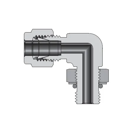 Угловой поворотный штуцер для обжима DK-Lok предназначен для коммутации трубных линий измерительной и технологической арматуры, где требуется переход с резьбового подключения G3/4 на трубку 3/4". Конструкция решает задачу уплотнённого и ориентируемого соединения в ограниченном пространстве: вращающаяся резьбовая часть упрощает монтаж и поворот трубопровода без перекручивания трубки. Уплотнение резьбы обеспечивает O-ring со стопорным кольцом и шайбой по DIN 3852 (форма H), а герметизация трубки достигается обжимом двумя обжимными кольцами и гайкой.