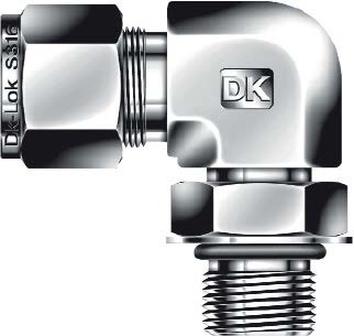 Корпус и обжимные элементы — нержавеющая сталь AISI 316, стойкая к коррозии и агрессивным средам. Соединение — двухколечная обжимная система DK-Lok, наружная резьба UNF 3/4"-16 (канал 1) и трубное подключение 3/8" (канал 2). Уплотнение резьбы — выступающее O-ring (возможны исполнения с NBR, FKM или PTFE в зависимости от комплектации). Рабочее давление в типичных конфигурациях может достигать порядка 6000 psi (≈414 бар) в зависимости от диаметра и комплектации; температурный диапазон определяется материалом O-ring: NBR ≈ -30…+120 °C, FKM ≈ -20…+200 °C, PTFE до +260 °C. Применимо для гидравлики, технологических паров, масел и инертных газов.