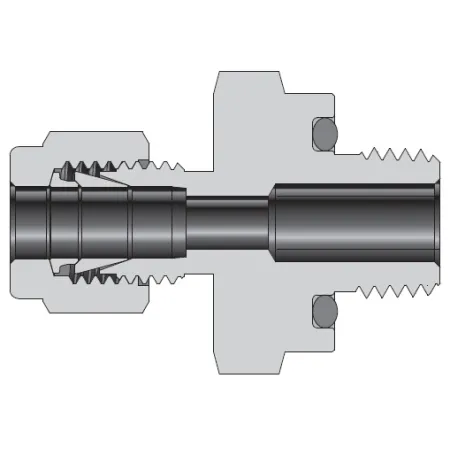 Корпус и основные детали — нержавеющая сталь AISI 316, что обеспечивает коррозионную стойкость в агрессивных средах. Исполнение — двухобжимное (две обжимные втулки + гайка) для надёжной фиксации трубки 3/4". Уплотнение резьбы — утопленное O-ring (обеспечивает мягкую герметизацию и компенсацию микронеровностей). Тип подключения: канал 1 — резьба UNF 1 1/16″-12, канал 2 — трубка 3/4". Ориентировочный рабочий диапазон давления для подобных фитингов из AISI 316 — до 6000 psi (≈414 бар) в зависимости от толщины стенки трубки; рабочая температура с O-ring FKM примерно −20…+200 °C (точно по материалу уплотнения).
