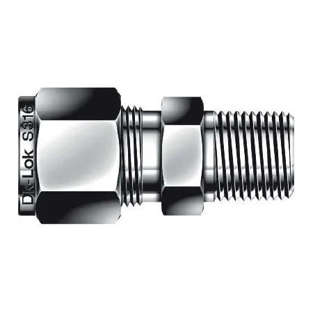 Корпус и элементы — нержавеющая сталь AISI 316, стойкая к коррозии и агрессивным средам. Уплотнение резьбы — ФУМ‑лента; уплотнение трубки — комбинированное: переднее и заднее обжимные кольца. Исполнение рассчитано на трубки промышленных диаметров (подключение каналов: NPT3/8 / 1″ трубка). Рабочие среды: природный газ, вода, пар, масла и химреагенты совместимые с AISI 316 и PTFE. Практические диапазоны: температур от ≈ −60°C до +200°C (зависит от среды и уплотнения), рабочее давление определяется типоразмером трубки и стенкой — типичные обжимные соединения DK‑Lok для подобных диаметров эксплуатируются в сотнях бар при корректной установке; для точного подбора ориентируйтесь на таблицы производителя по давлению и толщине стенки.