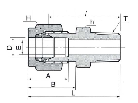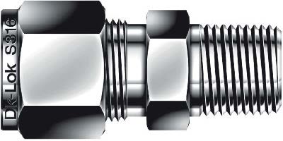 Корпус и обжимные элементы — нержавеющая сталь (материал корпуса AISI 316), что обеспечивает коррозионную стойкость и совместимость с агрессивными средами. Конструкция — двухкольцевая обжимная система DK-Lok, обеспечивает повторную сборку и надежную фиксацию трубки Ø1/4″. Резьба уплотняется ФУМ-лентой; рекомендуемое рабочее давление зависит от толщины стенки трубки, для стандартной 1/4″ трубки из нержавеющей стали типично до 600 бар (≈8700 psi), рабочая температура в зависимости от уплотнения — ориентировочно от −60 °C до +200 °C.