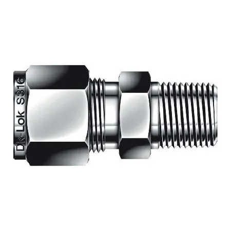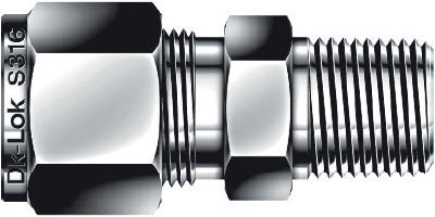 Корпус и обжимные элементы — нержавеющая сталь AISI 316, что обеспечивает коррозионную стойкость в агрессивных средах. Исполнение — двухкольцевой обжим (две феррулы + гайка) повышенной надежности по сравнению с одноферрульными системами. Резьба R1/4 применяется для присоединения к коническим резьбам по ISO; вторичный порт — трубка 1/2″. Рекомендуемая рабочая среда: технические газы, нефте- и химпродукты, вода и масла. Типичные эксплуатационные диапазоны для аналогичных изделий DK‑Lok: давление до 250–400 бар в зависимости от толщины стенки трубки, температура от −60°C до +200°C.