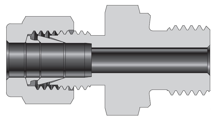 Корпус и комплектующие выполнены из нержавеющей стали AISI 316, устойчивой к коррозии и агрессивным средам. Конструкция — обжим трубки двумя кольцами и гайкой — обеспечивает надежную осевую фиксацию и повторяемость соединения при разборке/сборке. Уплотнение резьбы — металлическая прокладка DIN 3852‑2 (форма B) — рассчитано на высокие давления и температуры; типичный рабочий диапазон при корректной сборке: до ≈400 бар (в зависимости от трубки и рабочей среды) и температур от −196 °C до +400 °C. Применимо для газов и жидкостей, в том числе гидравлических масел, воды, инертных и многих химически активных сред.
