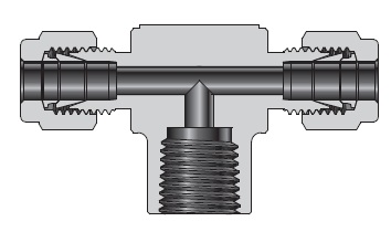 Тройник T-образный с осевой внутренней резьбой предназначен для ответвления и развязки линий трубопроводов на измерительных и технологических системах — сжатые газы, жидкости, гидравлика, сэмплирование и оснащение контрольно-измерительных приборов. Конструкция обеспечивает герметичное присоединение трубки Ø10 мм к корпусу с резьбовым подключением NPT1/2; резьма уплотняется ФУМ-лентой, а транспортировка среды по ответвлению осуществляется через центральный канал. Работа обеспечивается механическим обжатием двух обжимных колец и гайки, что формирует надежное металлическое уплотнение по трубке.