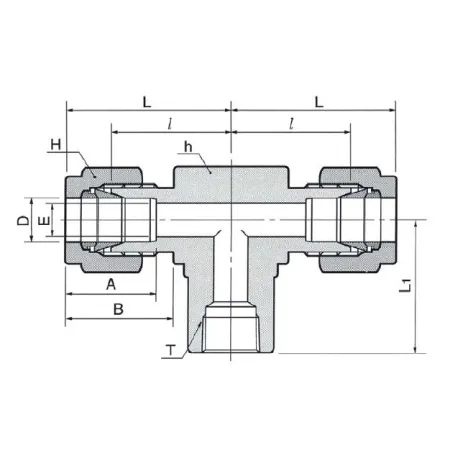 Тройник T‑образный с осевой внутренней резьбой NPT1/4 и ответвлением под трубку 6 мм предназначен для разветвления или отбора сред в технологических линиях измерения и управления (КИПиА), гидравлики и пневматики. Принцип работы — герметичное соединение металлической трубки 6 мм к корпусу с резьбовым присоединением NPT1/4 через обжимную конструкцию: две обжимные гильзы (фerrules) и крепёжная гайка обеспечивают металло‑металлическое уплотнение трубки, а резьба уплотняется ФУМ‑лентой.