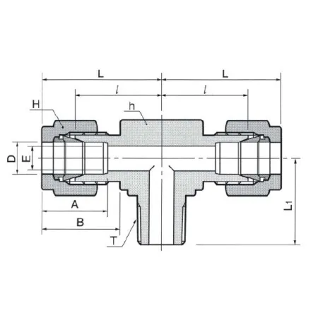 Тройник T-образный с осевой наружной резьбой R1/2 и ответвлением под трубку Ø10 мм предназначен для развязки и ответвления технологических и измерительных линий: подводы к датчикам давления, отводы в коллекторы, перекрестные соединения в гидравлике и пневматике. Функционирует по принципу обжимного соединения: трубка Ø10 мм фиксируется двумя обжимными кольцами и гайкой, обеспечивая металлическое уплотнение стенки трубки, а наружная резьба R1/2 уплотняется ФУМ-лентой (PTFE) для герметичности резьбового соединения. При правильном подборе трубки и монтаже обеспечивает стойкую герметичность при эксплуатационных давлениях, типично до порядка сотен бар, и рабочих температурах от -60°C до +200°C в зависимости от системы уплотнений.