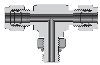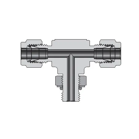 Тройник T-образный с наружной резьбой и осевым поворотом предназначен для развязки и ответвления трубных линий в контрольно-измерительных и гидравлических системах — например, подвод к датчикам давления, коллекторам и запорной арматуре. Соединение реализовано по принципу двухобжимного фитинга: трубка 1/4" фиксируется двумя обжимными кольцами и гайкой, а резьбовой стык UNF 7/16"-20 обеспечивает утечко‑стойкое присоединение через выступающее уплотнительное O-ring. Комбинация AISI 316 и кольцевого уплотнения обеспечивает герметичность при типичных рабочих давлениях прибл. до 400–420 бар для 1/4" трубок и в широком температурном диапазоне (см. ниже).