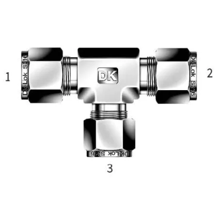 Корпус и обжимные элементы выполнены из нержавеющей стали AISI 316, что обеспечивает коррозионную стойкость к большинству технологических сред и совместимость с агрессивными средами при умеренных температурах. Тип конструкции — обжим трубки с двумя обжимными кольцами и гайкой (DK-Lok), обеспечивает повторяемую и ремонтопригодную сборку. Рабочие среды: вода, масла, технологические газы, неагрессивные химические растворы; при контакте с сильными хлоридами требуется проверка устойчивости AISI 316. Рабочие параметры зависят от диаметра и толщины стенки трубки: ориентировочно рабочее давление для ответвлений 1/4" — десятки мегапаскалей (в зависимости от трубки), для магистральных участков 1"–1-1/4" — порядка сотен бар при применении соответствующих труб и толщин стенок; температурный диапазон металла AISI 316 позволяет эксплуатацию в широком интервале от низких температур до ≈+350 °C при отсутствии уплотнительных материалов.