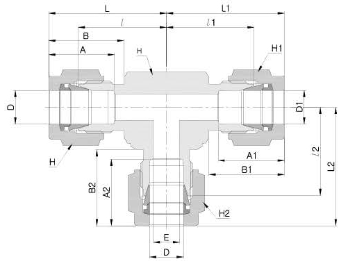 Тройник T-образный обжимной предназначен для ответвления и перекоммутации линий трубопроводов в системах приборного и технологического учёта, гидравлики и пневматики. Конструкция обеспечивает герметичное соединение трёх труб: два ответвления 1″ (трубка) и третье 1/2″ (трубка) при общем подключении корпуса 1-1/2″. Функционирует по принципу двойного обжима трубки двумя обжимными кольцами (двухфланцевое уплотнение) и гайкой, что создаёт металлометаллическую контактную поверхностную или металлокольцевую герметизацию без применения резьбового уплотнения с уплотнителем.