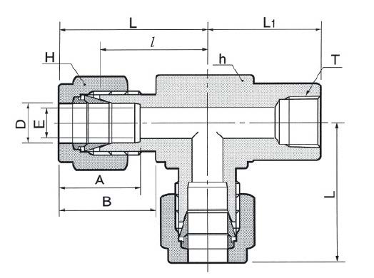 Угловой тройник T-образной формы с внутренней резьбой NPT1/2 и ответвлением под трубку 16 мм предназначен для развязки и разветвления технологических и контрольно-измерительных линий в системах гидравлики, пневматики, передачи технологических газов и сред. Работает по принципу герметичного соединения обжимом трубки двумя обжимными кольцами и гайкой — корпус из нержавеющей стали AISI 316 фиксирует кольца, которые формируют плотное металл-металл уплотнение; резьвовое соединение уплотняется ФУМ-лентой (PTFE) по стандарту NPT. Конструкция обеспечивает компактную угловую разводку с каналом NPT1/2 на один из ответвлений и посадкой под трубку 16 мм на другом.