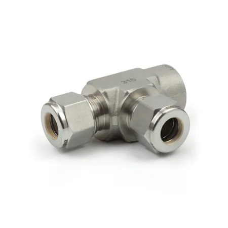 Тройник T-образный с внутренней конической резьбой и обжимным соединением применяется для ответвления магистралей в системах измерения и управления давлением, подачи технологических и аналитических сред. Соединение совмещает канал под резьбу NPT1/8 (внутр.) и компрессионный выход для трубки Ø8 мм, обеспечивая герметичное ветвление без сварки. Принцип работы — механическое уплотнение обжимом двух обжимных колец (феррулов) и гайки на корпусе из нержавеющей стали AISI 316; резьба дополнительно уплотняется ФУМ-лентой для NPT-стыка.