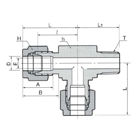 Угловой тройник T-образный с наружной NPT-резьбой и обжимным соединением предназначен для развилки и подведения технологического или измерительного трубопровода в системах КИПиА, гидравлики и пневматики. Подключение канала 1 — NPT 1/4 (наружная коническая резьба), канал 2 — обжим под трубку 1/8″; конструкция обеспечивает герметичное ответвление без сварки и с минимальной мёртвой зоной. Уплотнение резьбы выполняют ФУМ-лентой, герметичность трубчатого соединения достигается за счёт двух обжимных колец и гайки: при затяжке переднее кольцо формирует уплотнение на трубке, заднее фиксирует посадку.