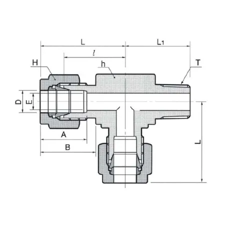 Тройник T-образный с угловой наружной резьбой предназначен для разведения и ответвления рабочих сред в технологических и контрольно-измерительных линиях: инструментация, сжатый воздух, инертные и нейтральные жидкости и газы. Подключение R1/4 служит в качестве резьбового ввода, два обжимных посадочных места рассчитаны на трубку Ø3 мм. Функция обеспечивается за счёт двух обжимных колец и гайки, которые при затяжке герметично фиксируют трубку, а резьвое соединение уплотняется ФУМ-лентой.
