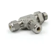 Обжимной тройник T-образный с наружной резьбой UNF 2 1/2″-12 и ответным каналом под трубку 2″ предназначен для ответвления потока в системах технологической арматуры и КИПиА. Конструкция решает задачи герметичного подключения стальных трубопроводов в линиях давления и передачи технологических сред: жидкостей, гидравлических масел, инертных газов. Функционирование основано на механическом обжатии трубки двухзаходным набором — две обжимные гильзы (ferrule) и гайка создают осевое смятие трубы и постоянное уплотнение; резьбовой стык дополнительно герметизируется выступающим O-ring.