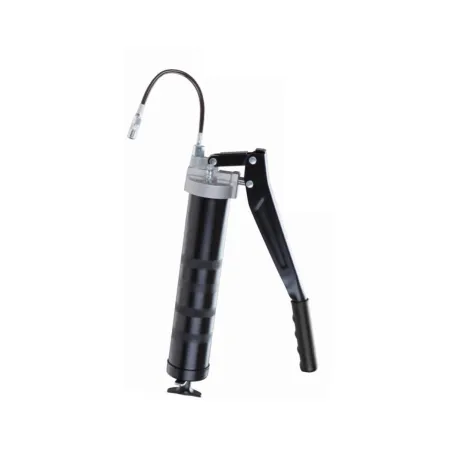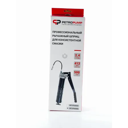 Рычажный шприц для подачи консистентной смазки в рабочие узлы техники и оборудования. Производительность составляет 2,4 г/ход. Рабочее давление 413 бар. Объем шприца 500 см3. Соединение 1/8" BSPT. Оснащен гибким шлангом 300 мм с 4-лепестковой насадкой
