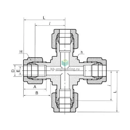 Крестовина X-образная обжимная для трубки 3/16" (4,76 мм) предназначена для развязки и распределения сред в приборных и технологических линиях: системах отбора проб, измерительных контурах, манометрии и малогабаритных гидравлических схемах. Принцип работы — механическое герметичное соединение металлической трубки с помощью двух обжимных колец (двухфланцевая система) и гайки: при затяжке гайки передняя и задняя обжимные кольца фиксируют трубку, формируя металло-металлическое уплотнение без применения уплотнительных паст. Такое исполнение обеспечивает надежность при динамических и циклических нагрузках и предотвращает протечки в четырех направлениях одновременно.