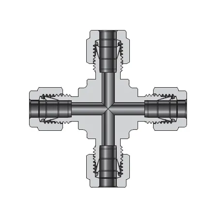 Крестовина X‑образная обжимная для трубки 8 мм предназначена для развязки и распределения рабочей среды в линиях технологической и инструментальной автоматики, системах отбора проб, гидравлики и пневмообводки. Конструкция решает задачу четырехпоточного подключения одного участка трубопровода без применения сварки или резьбовых тройников: плотное соединение достигается за счет обжима трубки двумя обжимными кольцами и гайкой, что обеспечивает металлическое уплотнение и минимальные утечки при средних и высоких давлениях.
