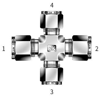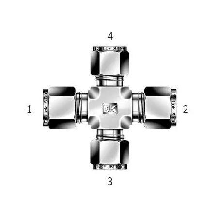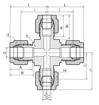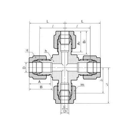 X‑образная обжимная крестовина предназначена для разветвления и соединения трубопроводов приборного и технологического назначения: одна ветвь под трубку Ø16 мм и три ветви под трубки Ø6 мм. Принцип работы — механическое уплотнение через систему из двух обжимных колец (фитильных феррул) и гайки: при затяжке гайки наружная феррула прижимается к трубке и внутренней ферруле, формируя герметичный металлический или металл‑полимерный контакт без применения уплотнения резьбы.