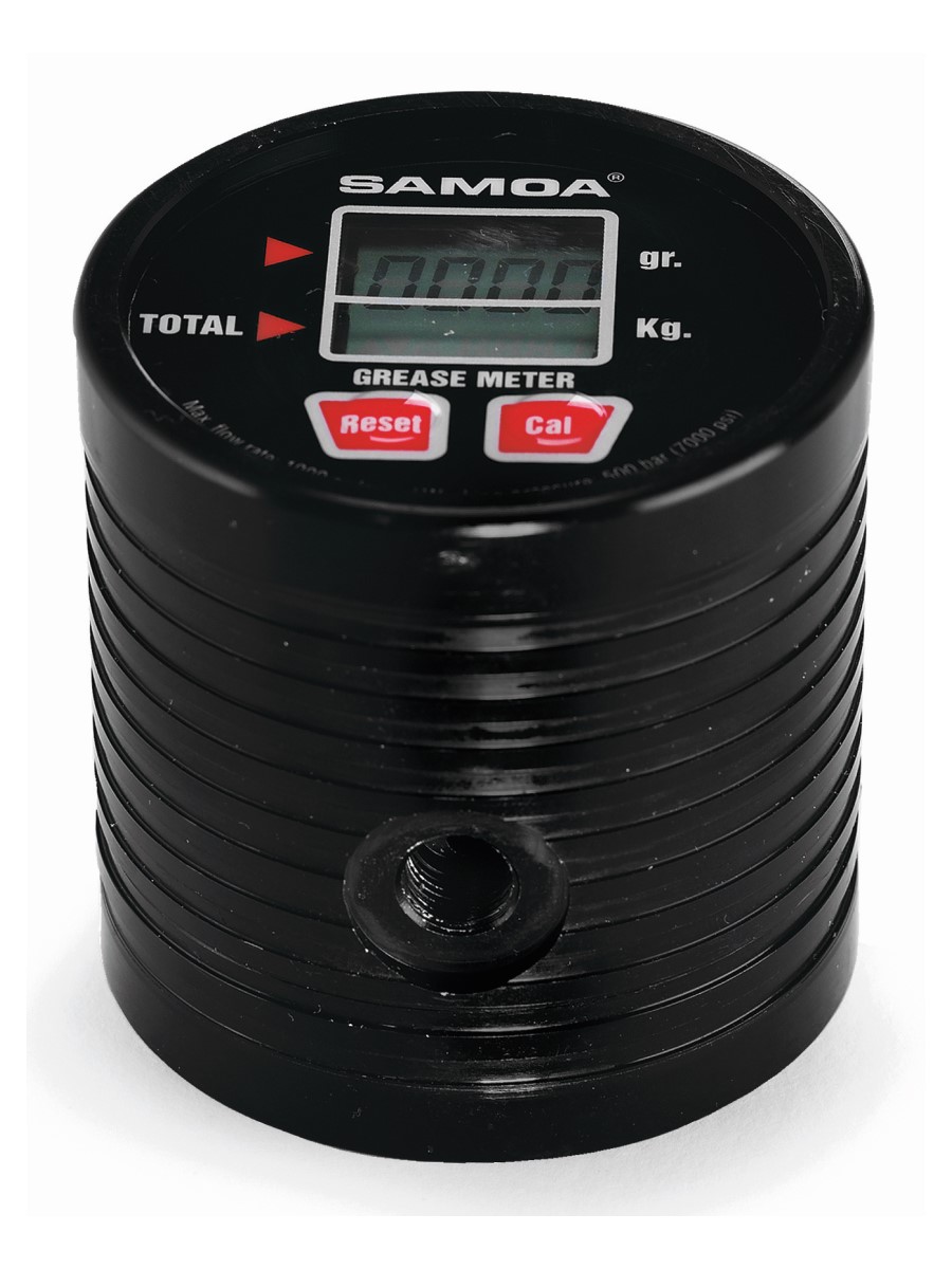 Линейный счетчик для консистентной смазки. Счетчик с овальными шестернями с электронным цифровым ЖК-дисплеем для раздачи консистентной смазки под высоким давлением. Индикация закачанного количества смазки в граммах (до 9999 граммов) и суммарного количества в килограммах (до 999999 кг). Показания дозировочного дисплея сбрасываются нажатием кнопки. Счетчики калиброваны на заводе и могут быть перекалиброваны на месте с целью повышения точности. Работает от двух щелочных батареек AAA 1,5В. Максимальное давление: 500 бар (7140 фунт/кв. дюйм). Макс. расход: до 1 кг/мин (2,2 фунт/мин). Погрешность: ± 3,0 %. Соединения на входе и выходе: 1/8" BSP (F).