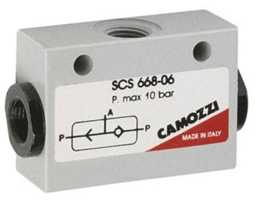 Перекидной клапан Мод. SCS-668-06 выполняет логическую функцию “ИЛИ” и предназначен для подачи на выход любого из 2-х сигналов, поступающих на входы. Специальная конструкция обеспечивает надежное уплотнение между входными отверстиями для исключения ложных срабатываний и утечек воздуха.