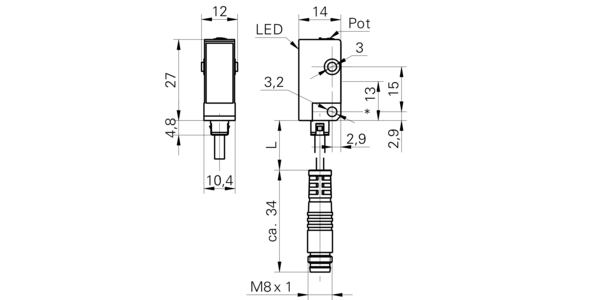 Дискретный выход: PNP • Диапазон измерения: 6000 мм • Электрическое подключение: разъём M8x1 3-пин, кабель • Класс защиты: IP65 • Рабочее напряжение: 12 ÷ 24 V DC • Материал корпуса: пластик