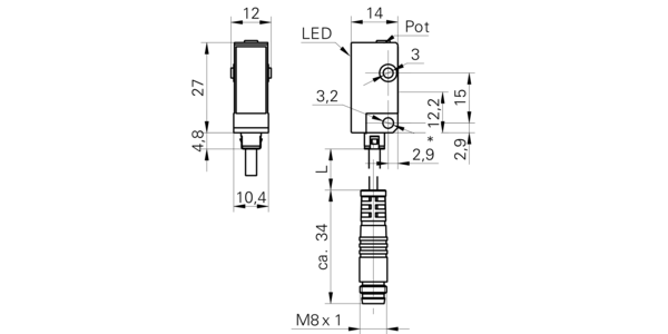 Дискретный выход: PNP • Диапазон измерения: 120 мм • Исполнение: с подавлением заднего фона • Электрическое подключение: разъём M8x1 3-пин, кабель • Класс защиты: IP65 • Рабочее напряжение: 12 ÷ 24 V DC • Материал корпуса: пластик