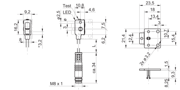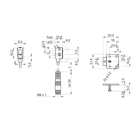 Диапазон измерения: 2500 мм • Электрическое подключение: разъём M8x1 4-пин, кабель • Длина кабеля: 0.2м • Класс защиты: IP65 • Рабочее напряжение: 12 ÷ 24 V DC • Материал корпуса: пластик
