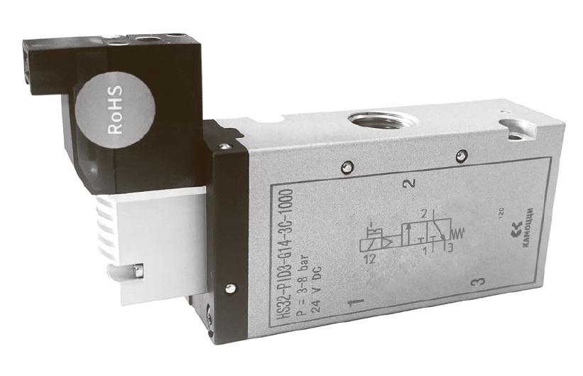 3/2 распределитель с электромагнитным управлением и пилотным каскадом.