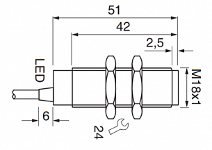 Дискретный выход: НО, PNP • Номинальная дистанция переключения: 5мм • Электрическое подключение: кабель • Длина кабеля: 2м • Крепежная резьба: M18x1 • Класс защиты: IP67 • Рабочее напряжение: 24 V DC • Материал корпуса: сталь нержавеющая