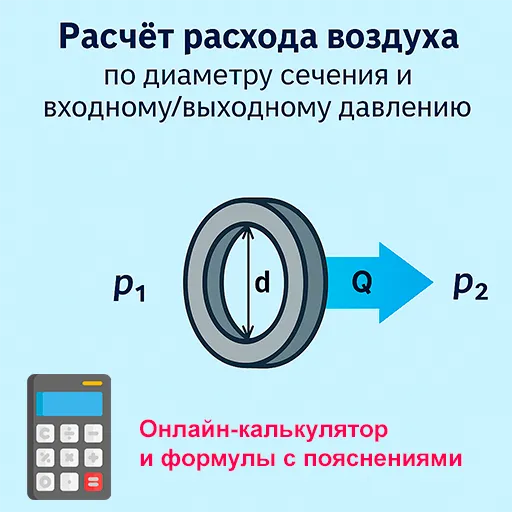 Этот калькулятор предназначен для расчёта расхода воздуха через круглое отверстие с учётом входного и выходного давления, а также диаметра отверстия.