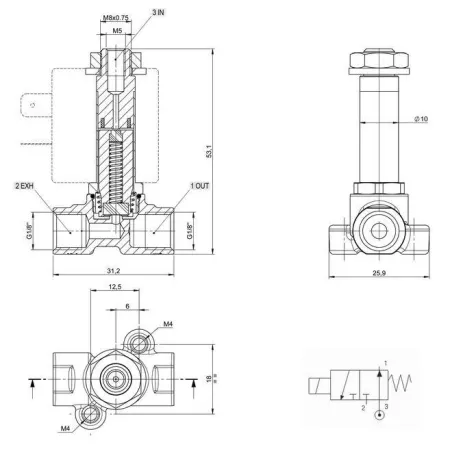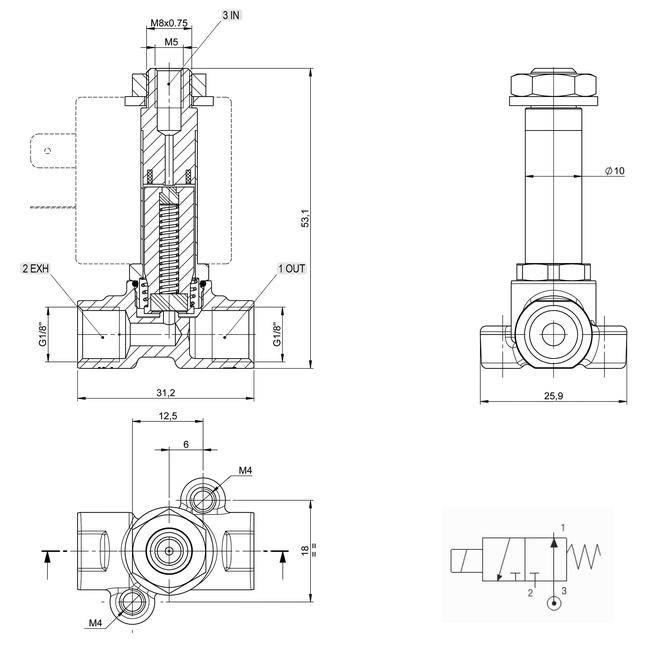 3/2 распределитель прямого действия с электромагнитным управлением.