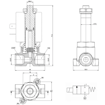 3/2 распределитель прямого действия с электромагнитным управлением.
